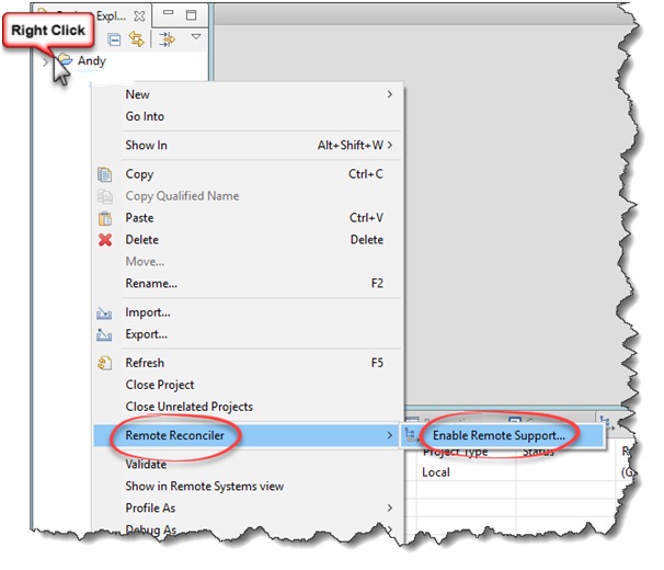 To accomplish this, right click on the project name and then select Remote Reconciler > Enable Remote Support…