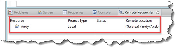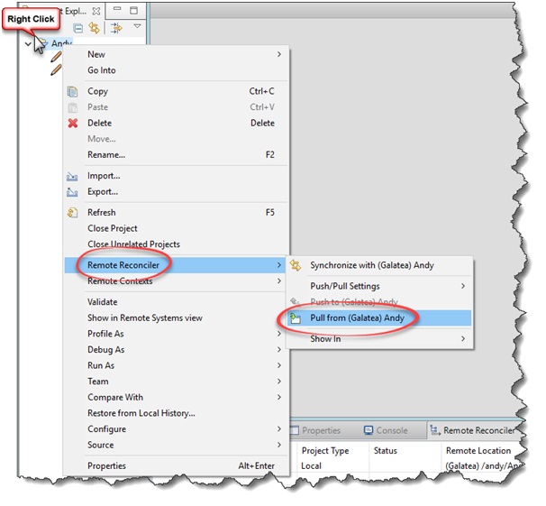 The other method is to look into the Remote Reconciler view, by right clicking on the Remote Reconciller entry and select Pull From … Again we cannot individually select source to download into our project. Maybe a future enhancement IBM?
