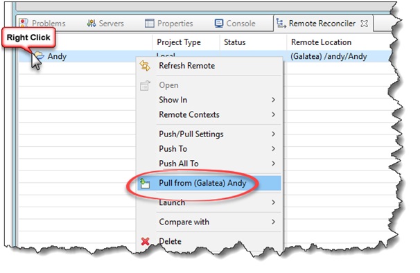 The first way is to right click on your project name, then Remote Reconciler > Pull From (System Name)