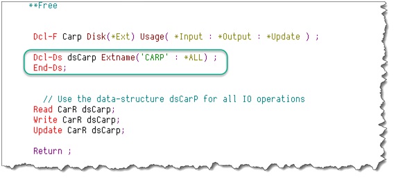 In the following example, we have defined the data-structure dsCarp as externally described based on our CARP file, and it can be used for all IO operations.
