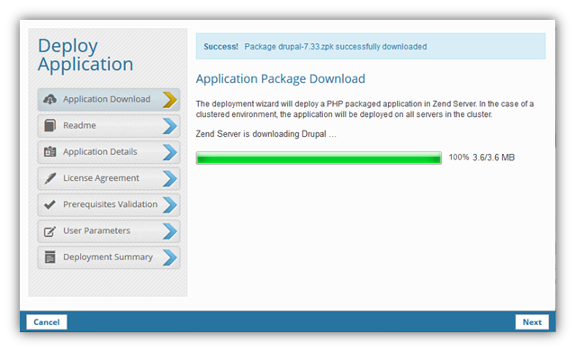 Taking Drupal as an example: the software package will be downloaded; you will be shown a readme document, enter some application details and parameters, and accept the software license. Zend Server will then do the rest – deploying the software in the IFS, generating Apache directives and creating the required MySQL database.