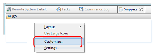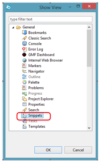 Firstly, we have to open the snippets view. This is achieved by selecting Windows → Show View → Other…