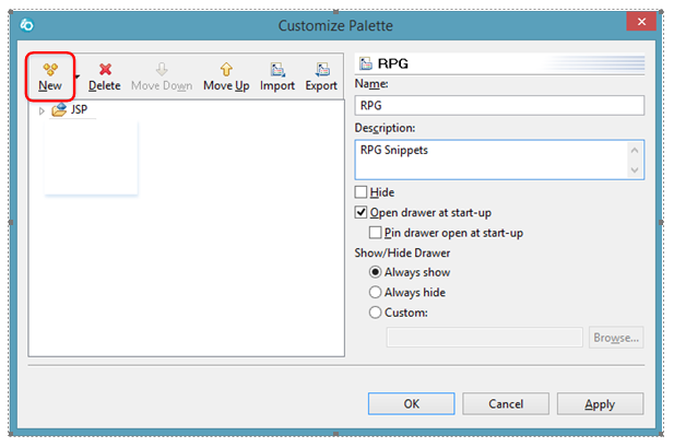 As we do not want our RPG snippets under the JSP category, let us create a new category called RPG where we can place all our RPG snippets.