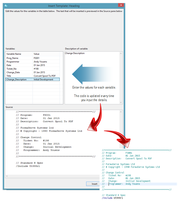 Code snippets are very similar to code templates and can be used to insert standard code into our source without having to open, then copy and paste, from other source members.