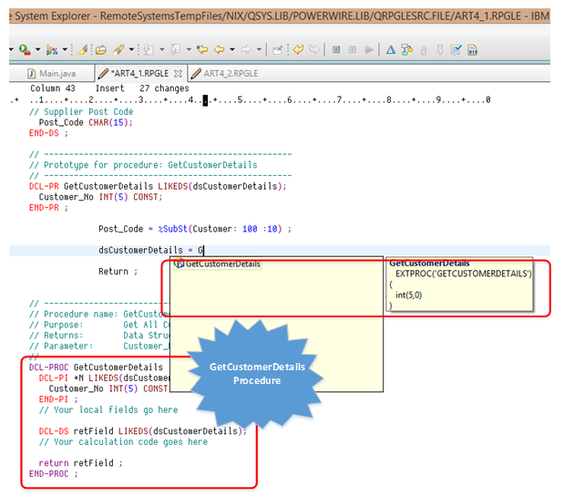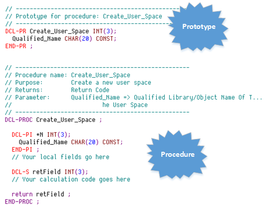 Enter all the details you need for the sub-procedure, including any parameters and return values. Once all details have been input, the code is generated and placed in the correct location within our source. Our prototype and procedure is shown in the figure below.