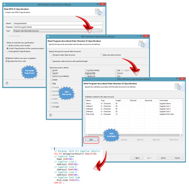 For this example, we are going to generate a data structure to hold our supplier details. Select the D-Specification type of Program described data structure.