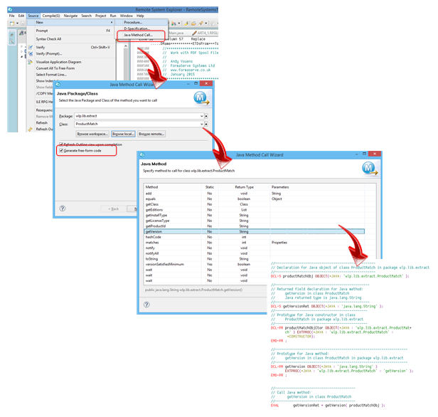 The features to allow us to call Java objects were introduced in V5R1 of RPG. The wizards can help us enormously in creating the entire necessary source. As with the previous two wizards, select Source → New → Java Method Call … This will start the Java wizard.