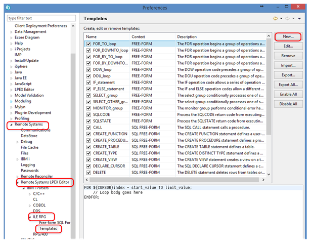 Unfortunately, there are no RPG snippets predefined for us but they are straightforward to create, so let us create some of our own.
