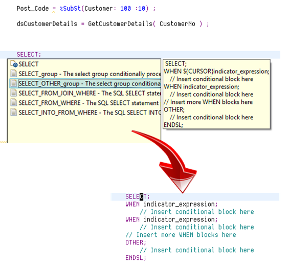 How do we use these templates? To include a template in your source, key the template name and press the ctrl-Space key combination. As can be seen below, I coded the SELECT keyword and pressed ctrl-Space then selected the SELECT_OTHER_group template and, voila! the select group template has been included for me.