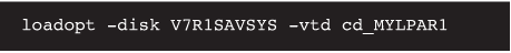 On MYLPAR1 we run the SAVSYS command specifying OPT01 as the device instead of a tape drive.