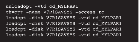 Once the SAVSYS is complete we unload the virtual optical disk from MYLPAR1, change it to read only access and then assign it to the new LPARs ready for a D type IPL.