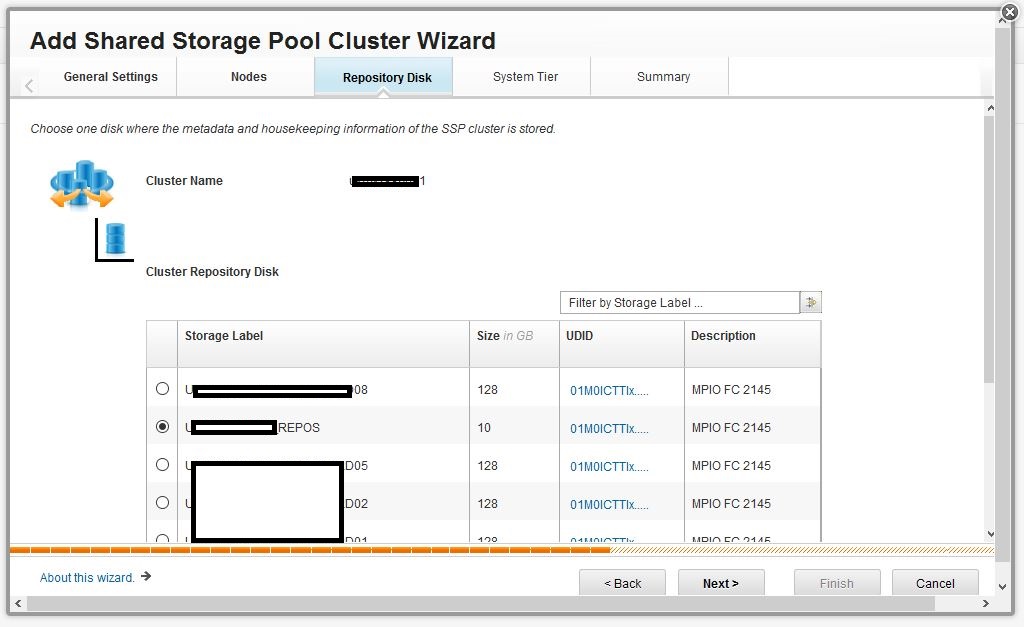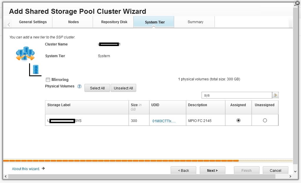 The wizard will display volumes (hdisks in VIOS) which are available to the SSP but currently unassigned to any SSP tiers.