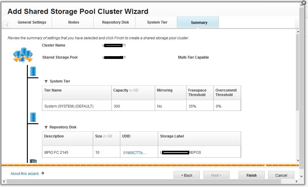 The wizard now displays a summary of my SSP showing the System tier, repository disk and the nodes (VIOS instances) which make up my SSP.