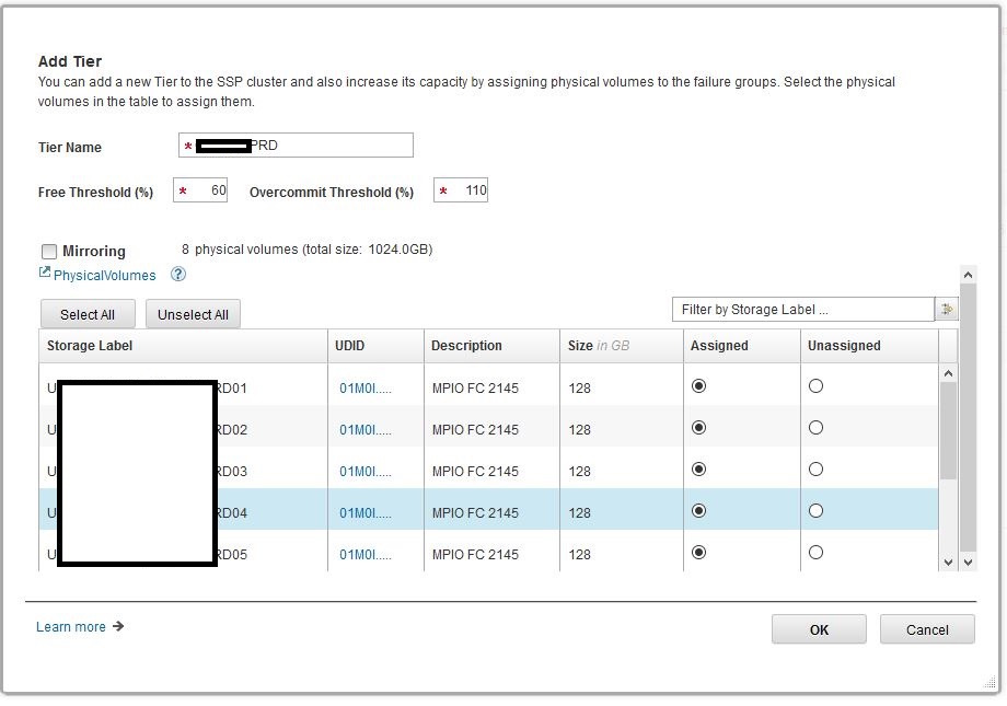 Again the Storage Label column shows the volume name as specified in the Storwize device. I selected the volumes I wanted to assign to the SSP tier and clicked OK.